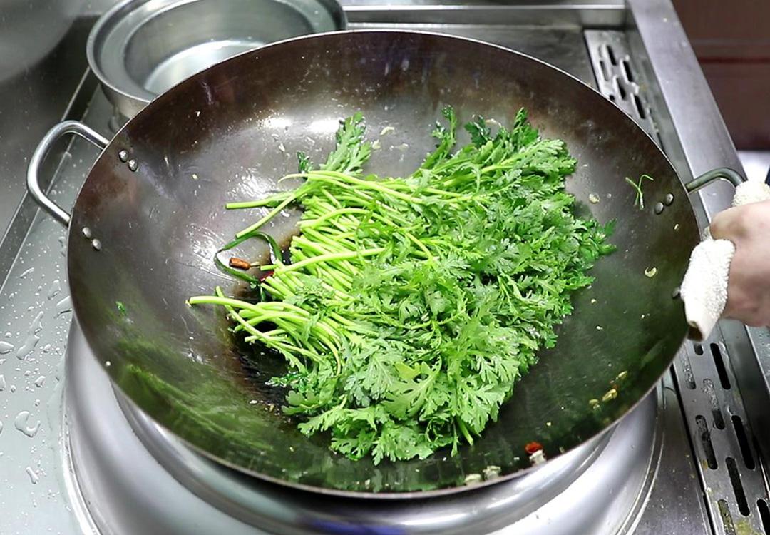 3.把锅烧热,加入植物油滑锅,滑好锅以后倒出热油加入凉油,热锅凉油炒菜时不容易粘锅,先把蒜末倒进去爆香吗,再放入虾皮和红椒段一起炒出香辣味,把茼蒿放入锅中铺平。